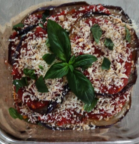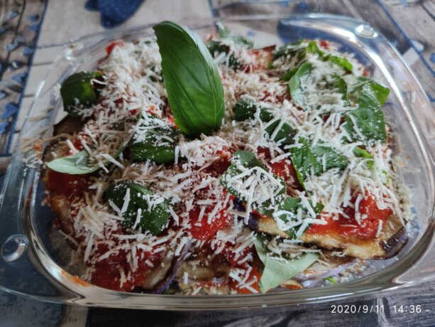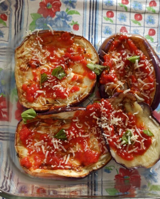 Preparare 2 melanzane viola, facendo delle fettine di circa 1,5 cm.