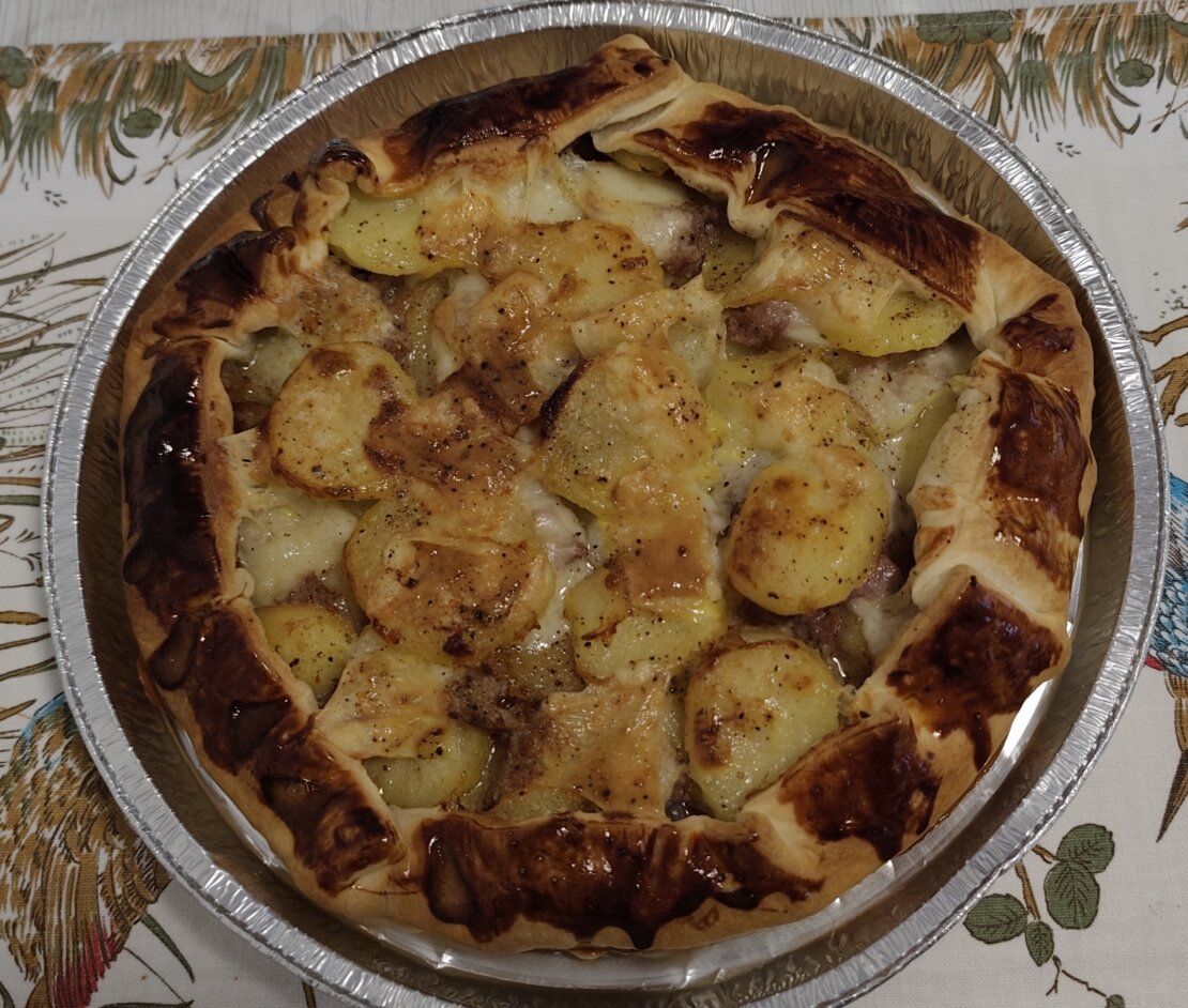 Fodero la base della torta (ovviamente l'ho messa dentro una teglia rotonda) con dello speck; ora posso aggiungere una metà dei dischetti di patate, aggiungo una bella salsiccia fresca spezzettata e completiamo con una bella porzione di formaggio di latteria (Fagagna di 8 mesi è perfetto) tagliato a strisce sottili.